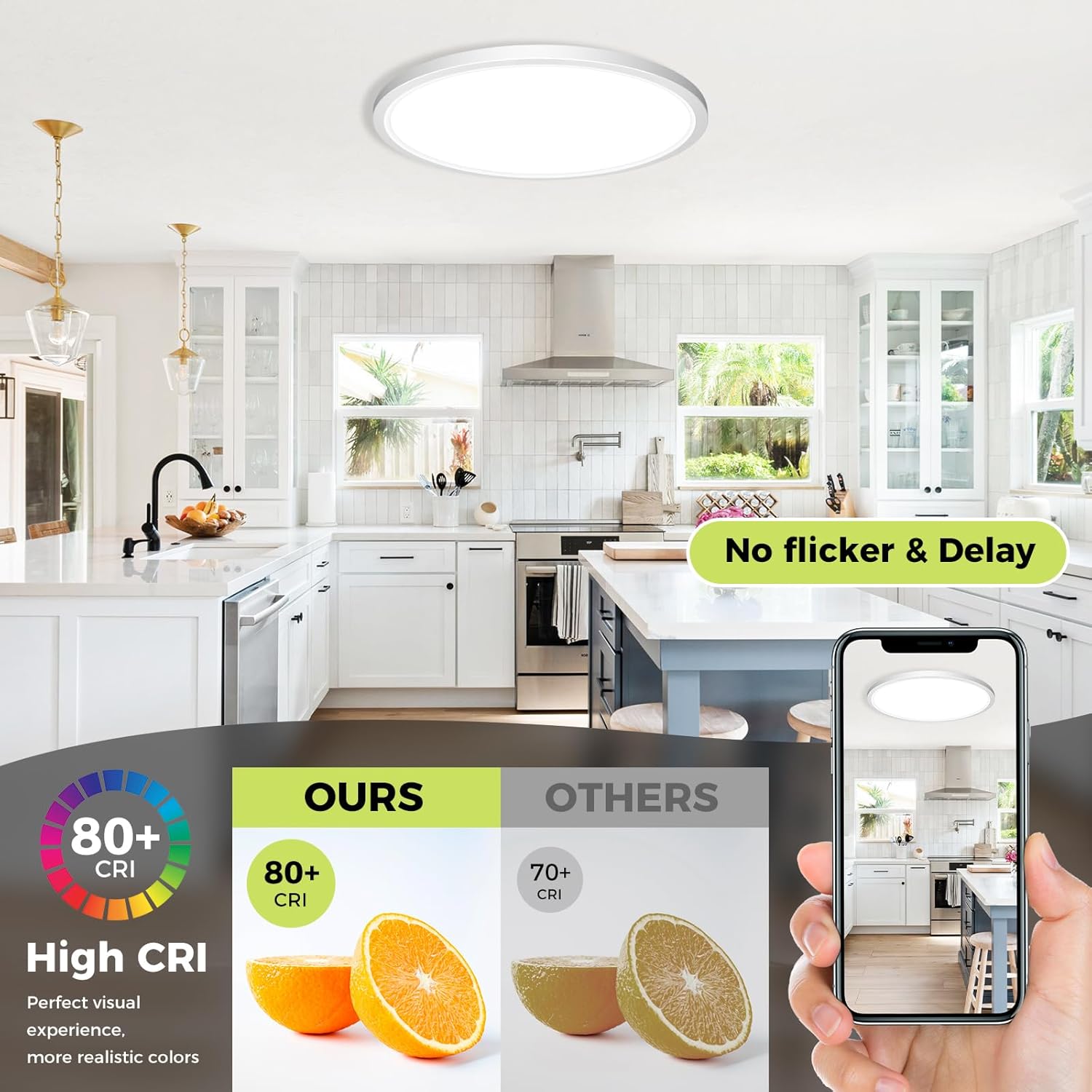 【Waterproof & Eye Protection】This ceiling light fixture is IP54 rated, ensuring waterproof performance, making it an ideal choice for bathrooms, kitchens and other wet areas.Our lights have a color rendering index of over 85+ (CRI), which can present true and vivid colors,and the light is soft and glare-free, which can protect the eyes from potential damage and create a comfortable light environment for the eyes
